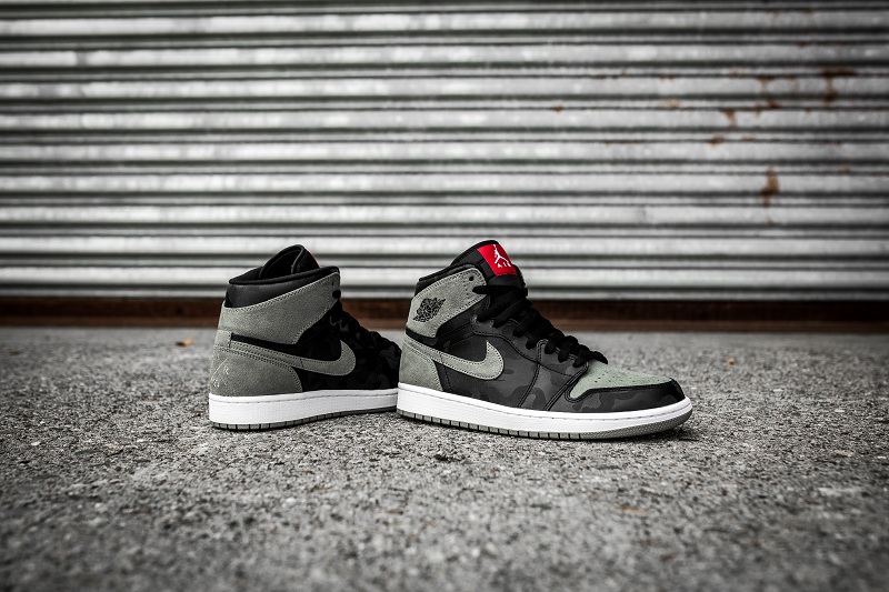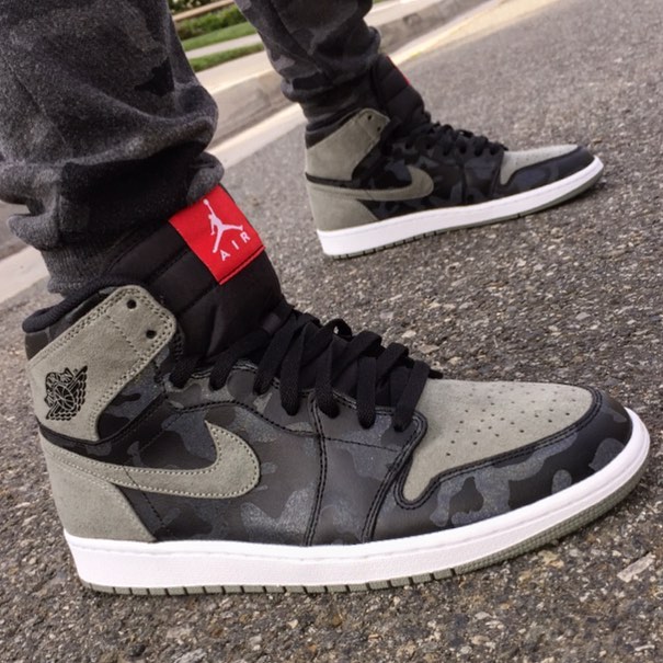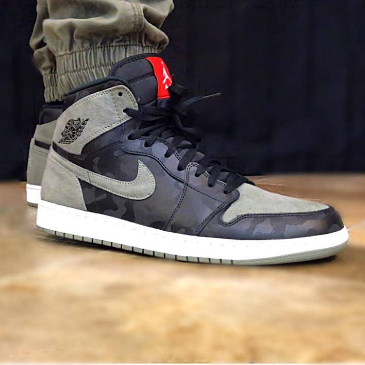 迷彩的AJ1并不多见,这款AJ1设计上采用印有黑灰迷彩图案的皮革结合灰绿色麂皮制作鞋身,不仅让人联想到 BAPE 招牌的「1ST CAMO」设计,同时辅以 3M 反光元素,以及特别设计的后跟「AIR 23」Logo 作点缀。上脚必定不俗。